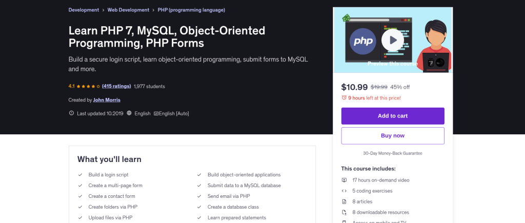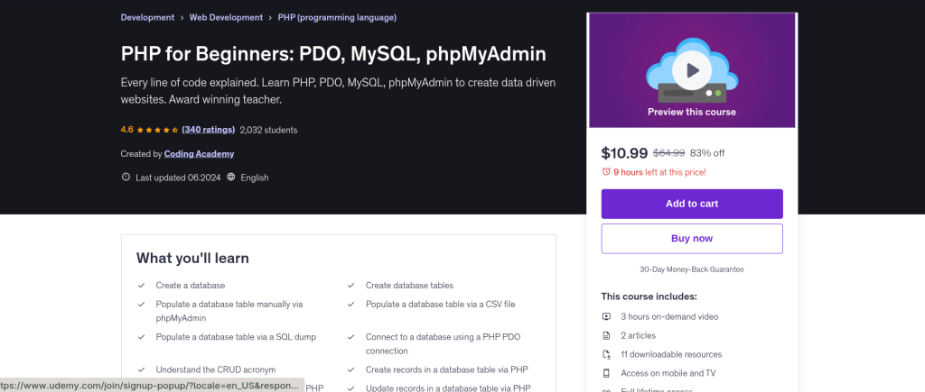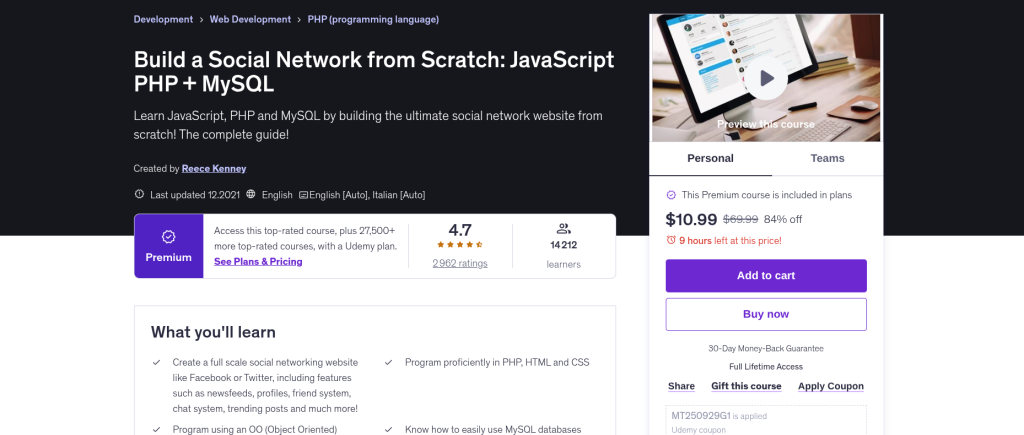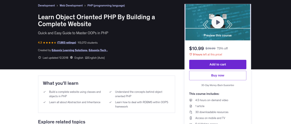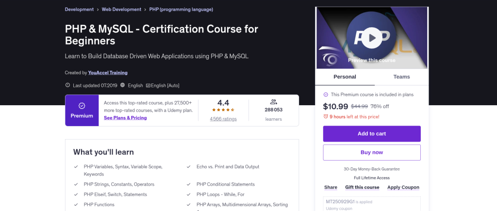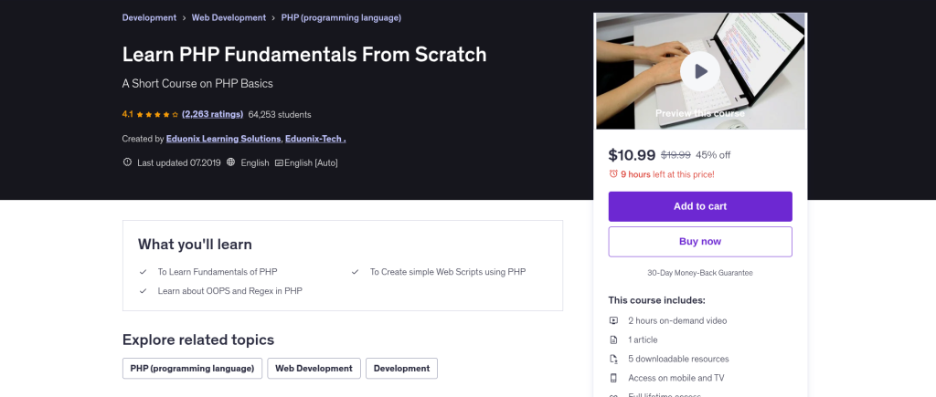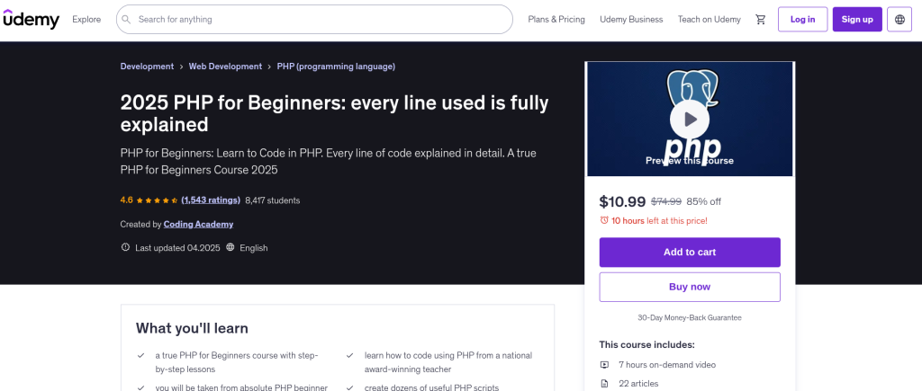 This extensive course explains PHP line by line, making it easy for beginners to understand. You’ll learn PHP built-in functions, loops, conditionals, and even create fun projects like a tic-tac-toe game and a session-based hit counter.