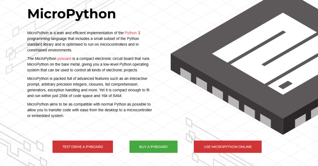 MicroPython is a streamlined and optimized implementation of Python 3, designed for microcontrollers and resource-constrained environments. It provides a simplified subset of the Python standard library. Its efficiency and portability make it an excellent choice for developing embedded applications, including IoT devices, robotics projects, and educational tools.