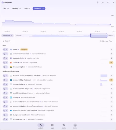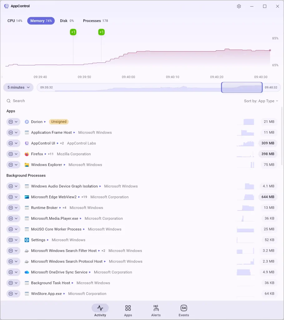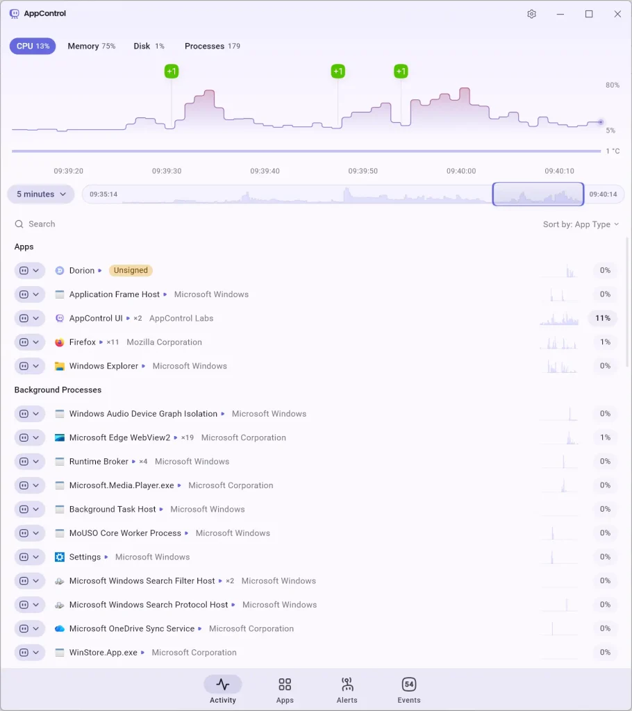 Unlike the default Windows Task Manager, which only shows what’s happening right now, AppControl keeps a rolling 3-day system activity history.