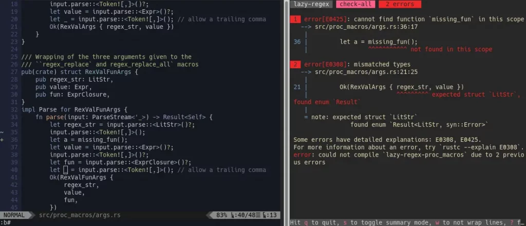 This fantastic utility takes care of checking your code in the background while you work, allowing you to focus on what really matters. It runs discreetly alongside your code editor and will alert you of any errors, warnings, or test failures in your Rust code. And all this without you having to lift a finger!