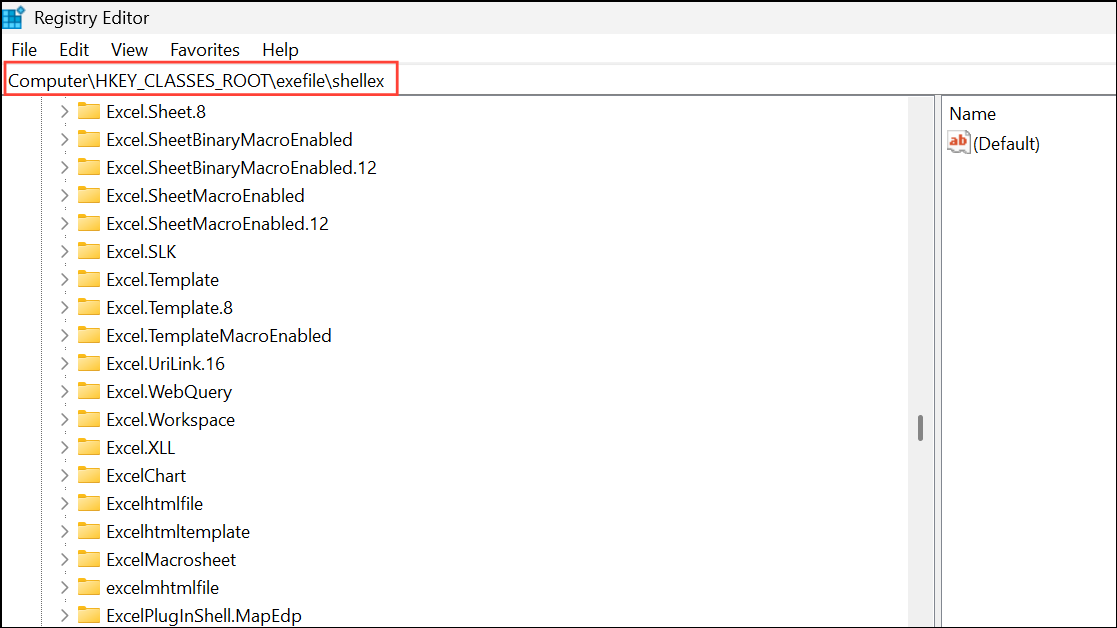 Step 2: In the Registry Editor, navigate to: HKEY_CLASSES_ROOT\exefile\shellex\