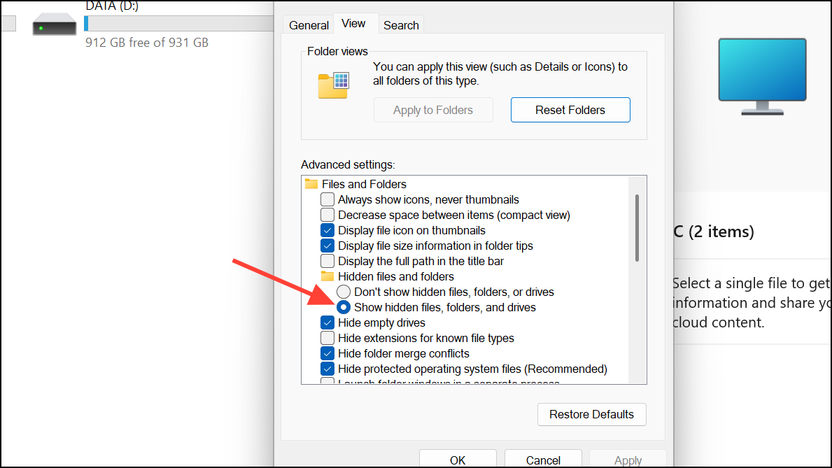 Step 2: In Folder Options, go to the View tab and check “Show hidden files, folders, and drives.” Click OK.