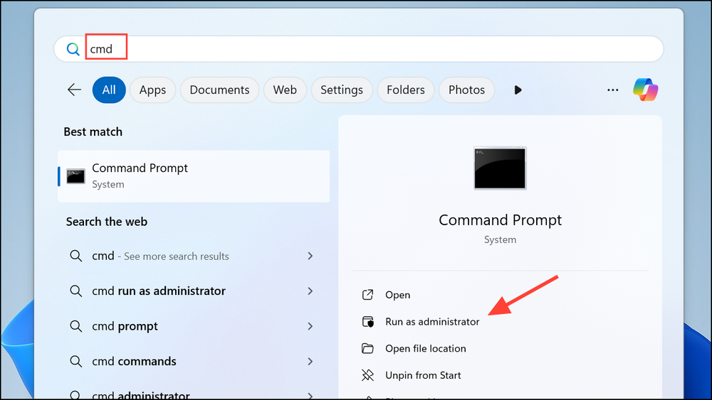 Step 1: Open the Start menu, type cmd, right-click “Command Prompt,” and select “Run as administrator.”