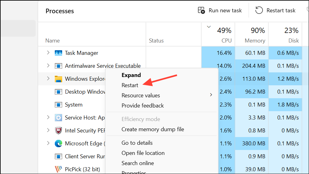 Step 2: If that doesn’t work, press Ctrl + Shift + Esc to open Task Manager. Locate “Windows Explorer,” right-click, and select “Restart.”