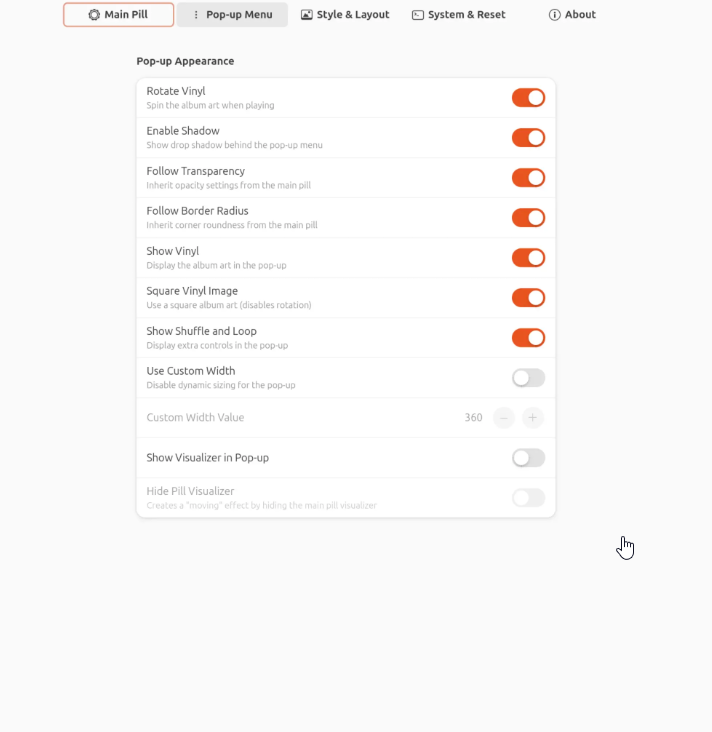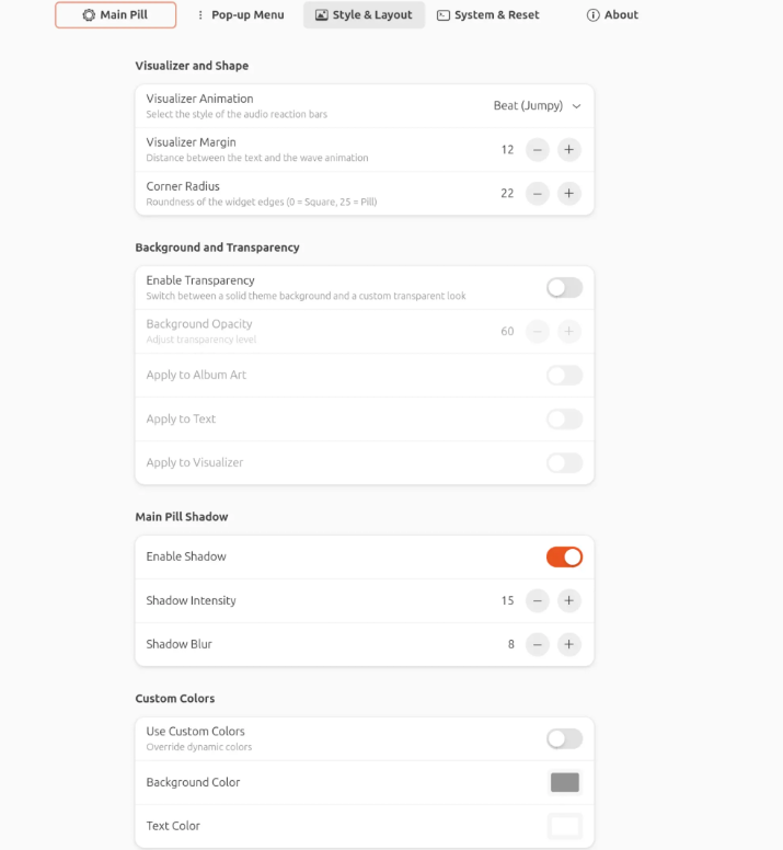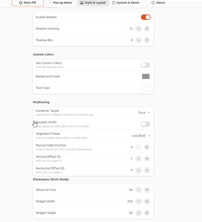 Dynamic Music Pill isn’t just a basic widget — it offers extensive customization across four settings tabs.