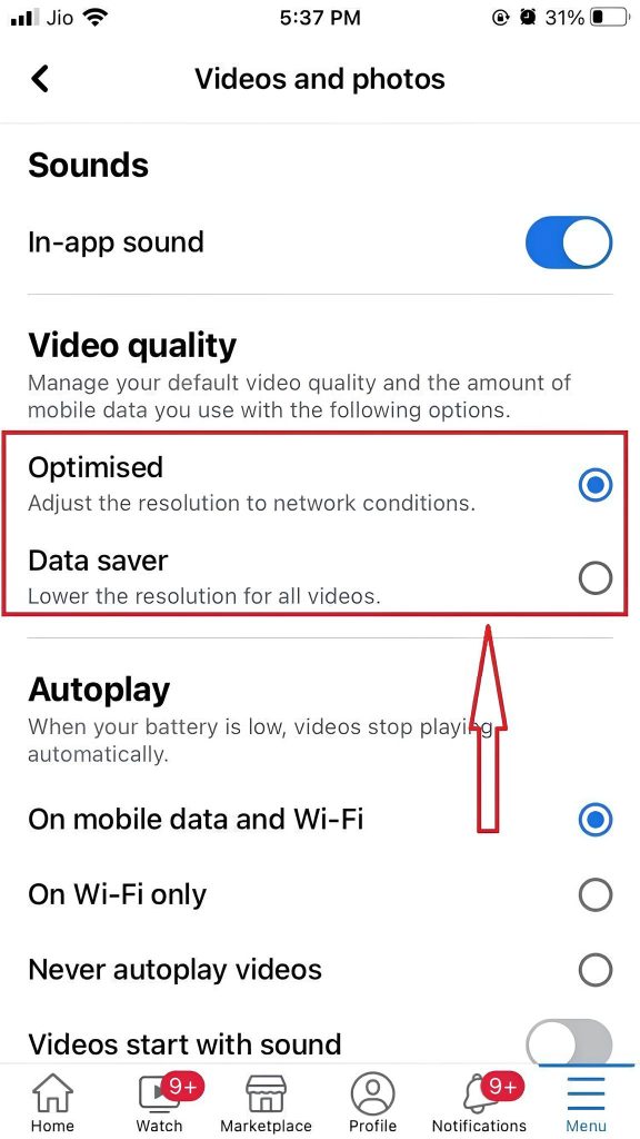 - Here, you’ll see two options for Video Quality: Data Saver and Optimized. Tap on the Optimized option to disable Data Saver Mode.
