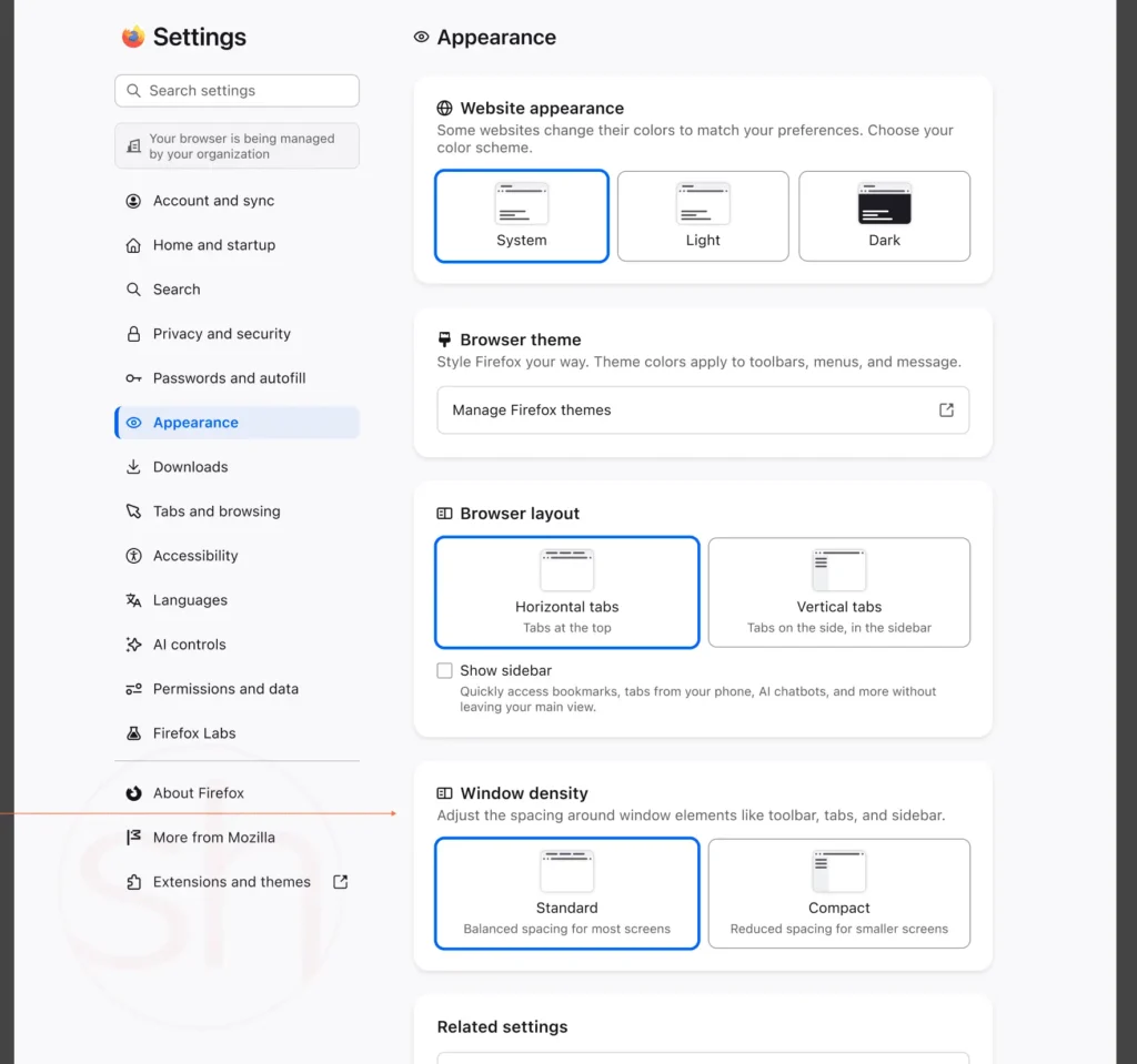 - Compact Mode – While Firefox has technically offered this mode for years, it’s no longer officially supported and is only accessible via hidden settings. Nova appears to bring it back prominently, with a “Window Density” option in the appearance settings, offering both Standard and Compact views.