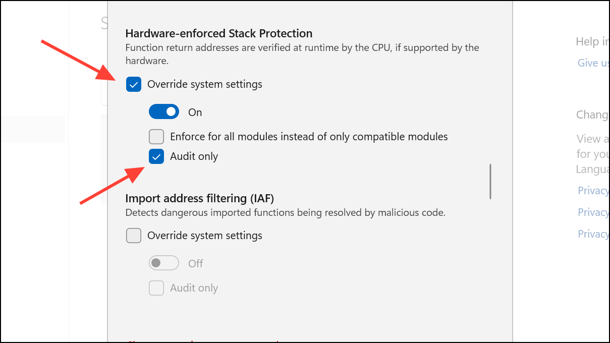 4- Modify Specific Setting: Find Hardware-enforced stack protection in the list, click Edit, set it to Override system settings, turn it On, and select Audit only. This change allows Chrome to run while merely logging any potential conflicts.