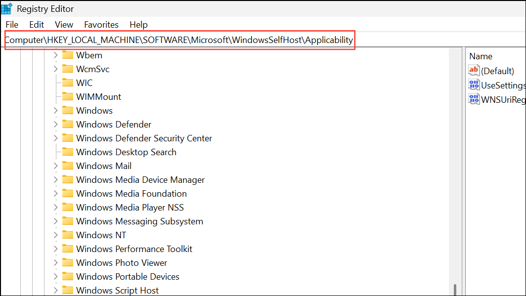 2- Navigate to the Correct Path: Go to HKEY_LOCAL_MACHINE\SOFTWARE\Microsoft\WindowsSelfHost\Applicability.