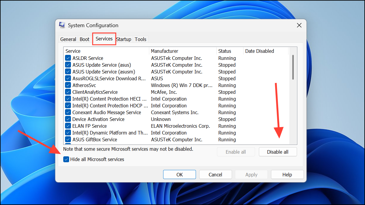 2- Disable Startup Programs: In the Services tab, check Hide all Microsoft services and click Disable all.