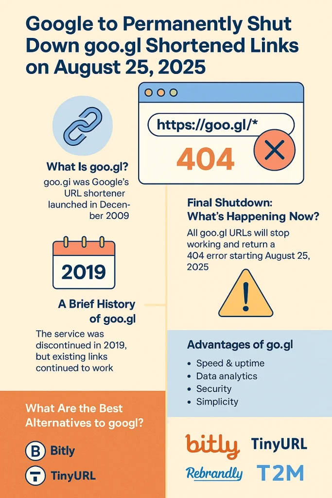 Although goo.gl has been discontinued since 2019, links created before then remained active—until now. As of August 25, 2025, all goo.gl URLs will permanently stop working and redirect users to a 404 error page.