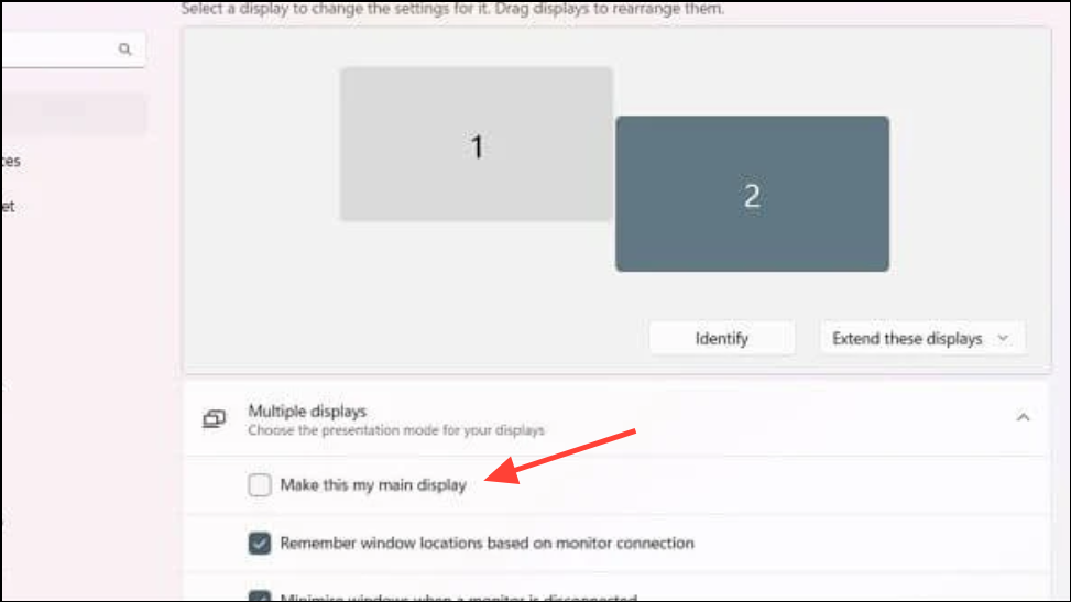 2- Find the “Make this my main display” Option: Scroll down within the settings related to the selected monitor. You’ll find the option labeled “Make this my main display.”