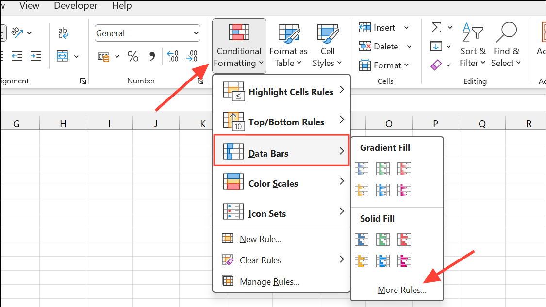 Step 3: Go to the Home tab, click Conditional Formatting > Data Bars > More Rules.