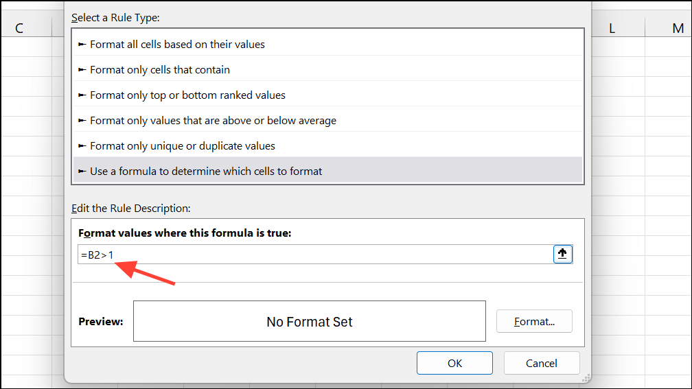 Step 3: Enter a formula like =B2>1