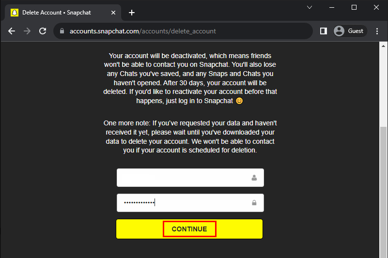 4- Confirm Deletion: You’ll be presented with the account deletion policy and required to enter your username and password to confirm the deletion request. Click “Continue.”