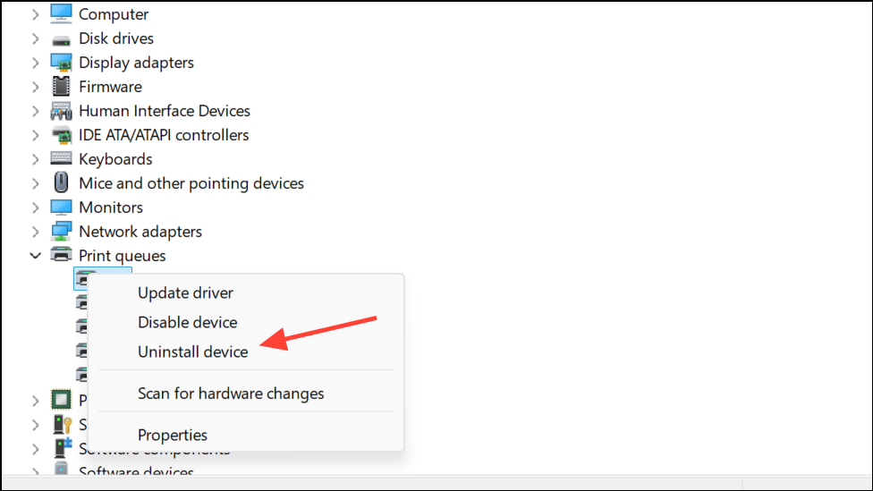 2- Uninstall the Printer: In Device Manager, right-click on your Canon printer under “Print queues” and select “Uninstall device.” Confirm the uninstall process and remove the driver.
