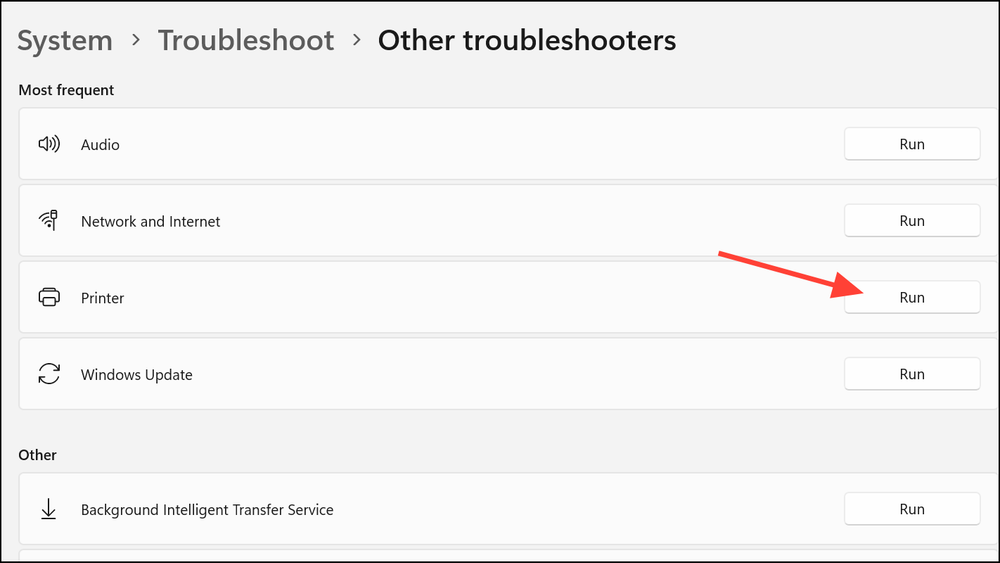 3- Run the Printer Troubleshooter: Locate “Printer” in the list and click the “Run” button. Follow the on-screen prompts as Windows attempts to diagnose and fix any printing issues. The troubleshooter may reset print queues, restart print services, or identify misconfigured settings.