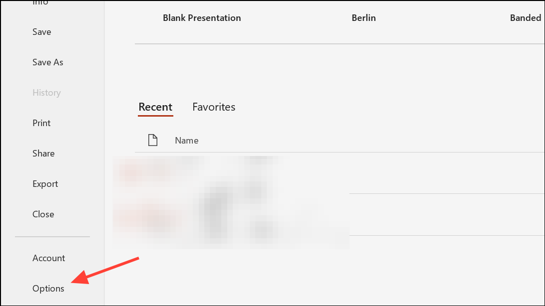 Step 2: Select Options at the bottom of the left pane to open the PowerPoint Options dialog.