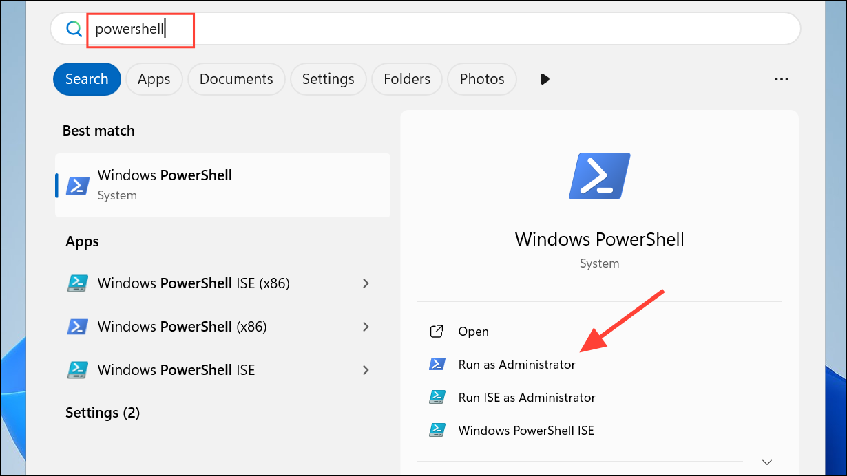 1- Open PowerShell as Administrator: Search for “PowerShell” in the Windows search bar. Right-click “Windows PowerShell” and select “Run as administrator.”