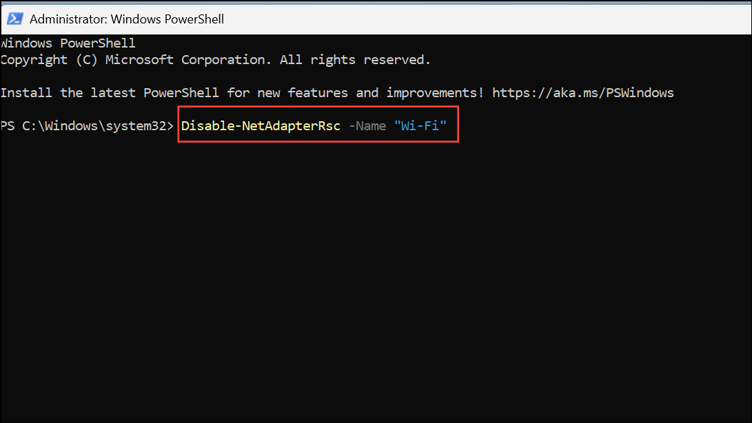3- Disable RSC: To disable RSC on your Wi-Fi adapter, use the command Disable-NetAdapterRsc -Name "Wi-Fi". Replace “Wi-Fi” with the actual name of your wireless adapter if it’s different.