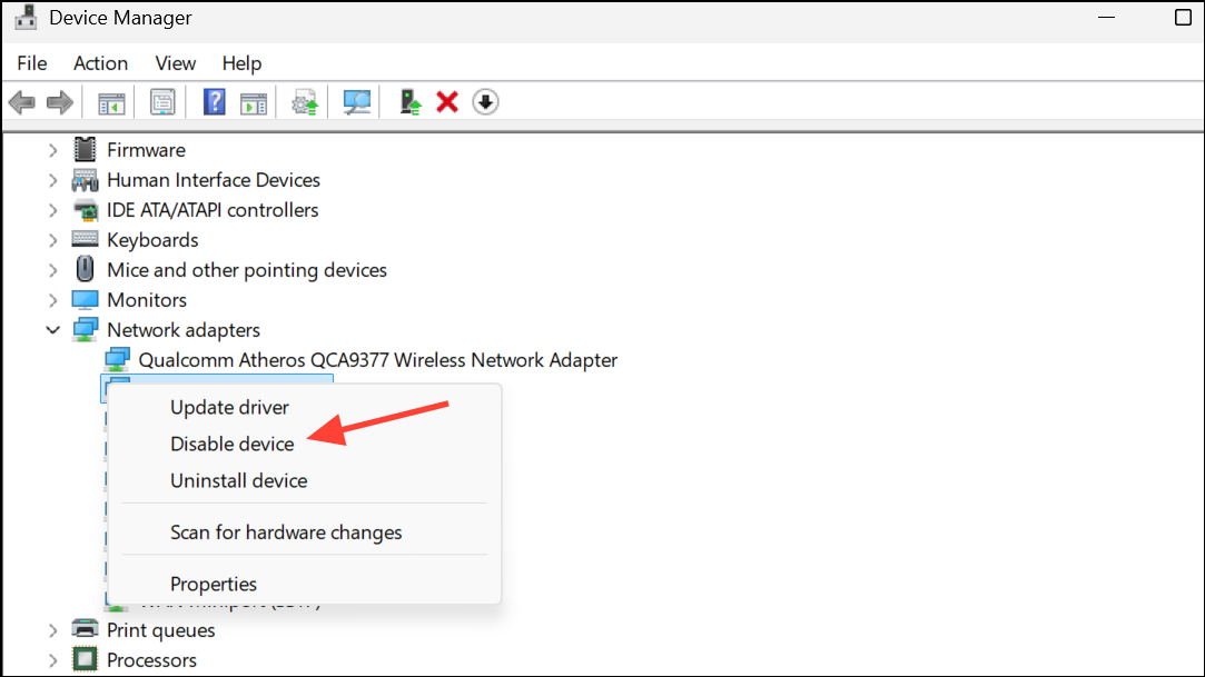 3- Disable Unused Adapters: Right-click each unused adapter and select “Disable device.” Be cautious not to disable your primary Ethernet or Wi-Fi adapter.