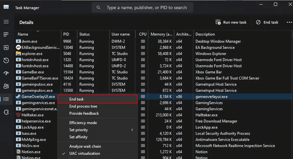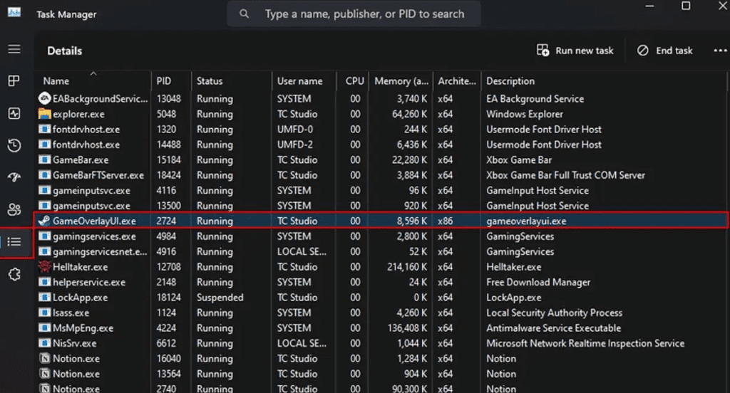 Switch to the Details tab and locate the GameOverlayUI.exe process.