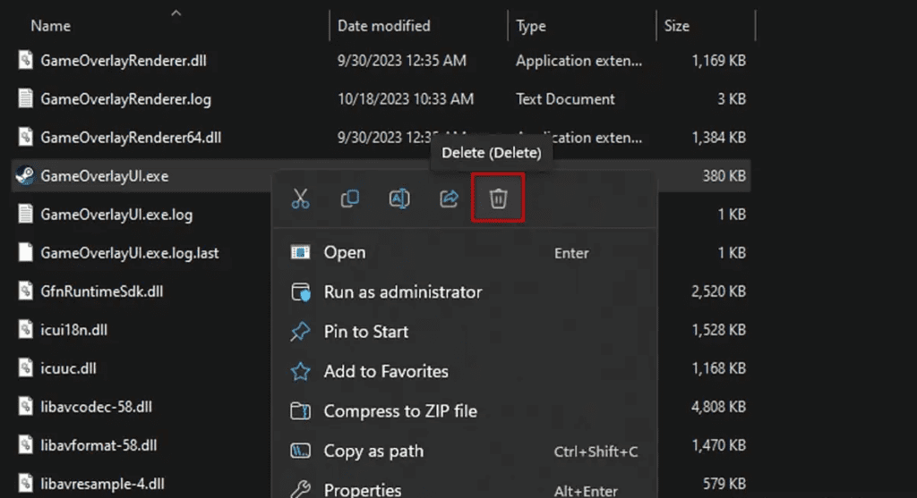 After deletion, Steam will automatically download and re-install the missing GameOverlayUI.exe file.