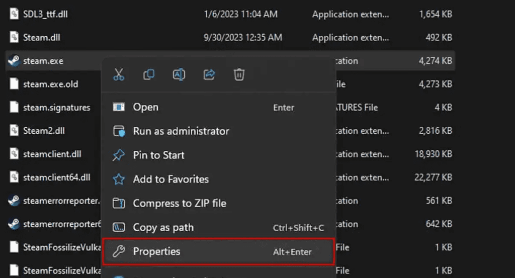 Right-click on Steam.exe and select Properties.