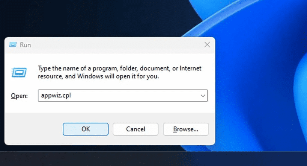 Open the Programs and Features window by running appwiz.cpl command on the Run terminal.