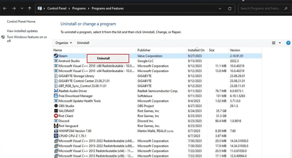 Right-click on Steam and select Uninstall to remove the application.
