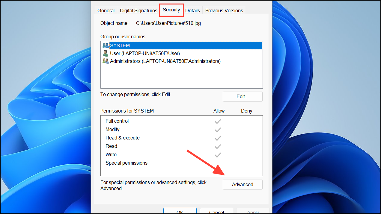 Step 2: Navigate to Advanced Security Settings: Go to the “Security” tab and click “Advanced” to open Advanced Security Settings.