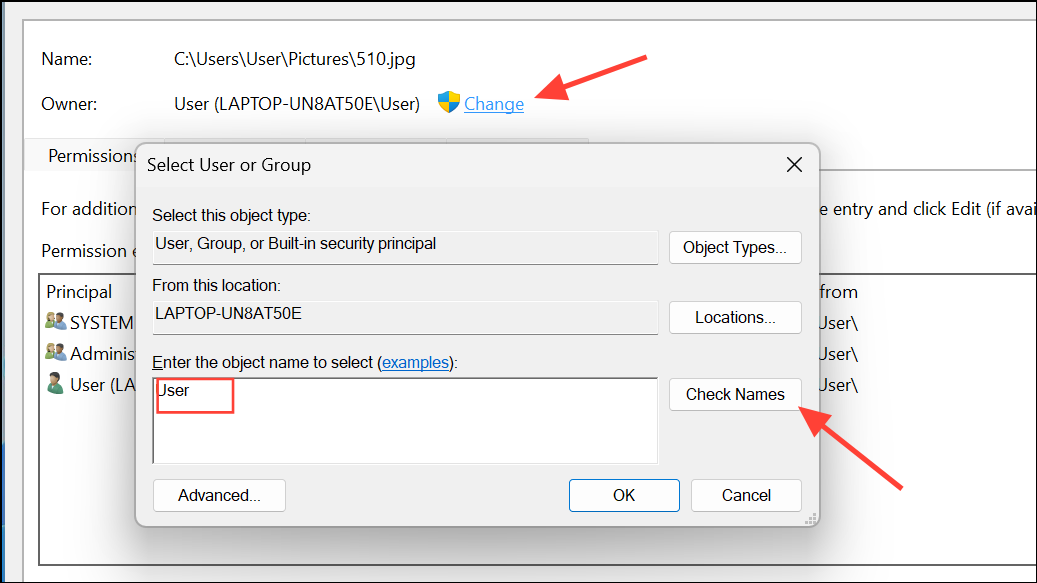 Step 3: Change the Owner: In the “Owner” section at the top, click “Change.” Enter “Users” (without quotes) in the “Enter the object name to select” field and click “Check Names” to validate the entry. Click “OK” to confirm.