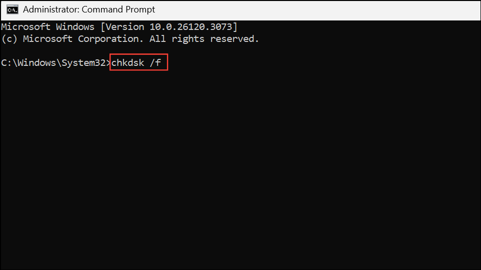 - Disk Error Check: Open Command Prompt as administrator and run