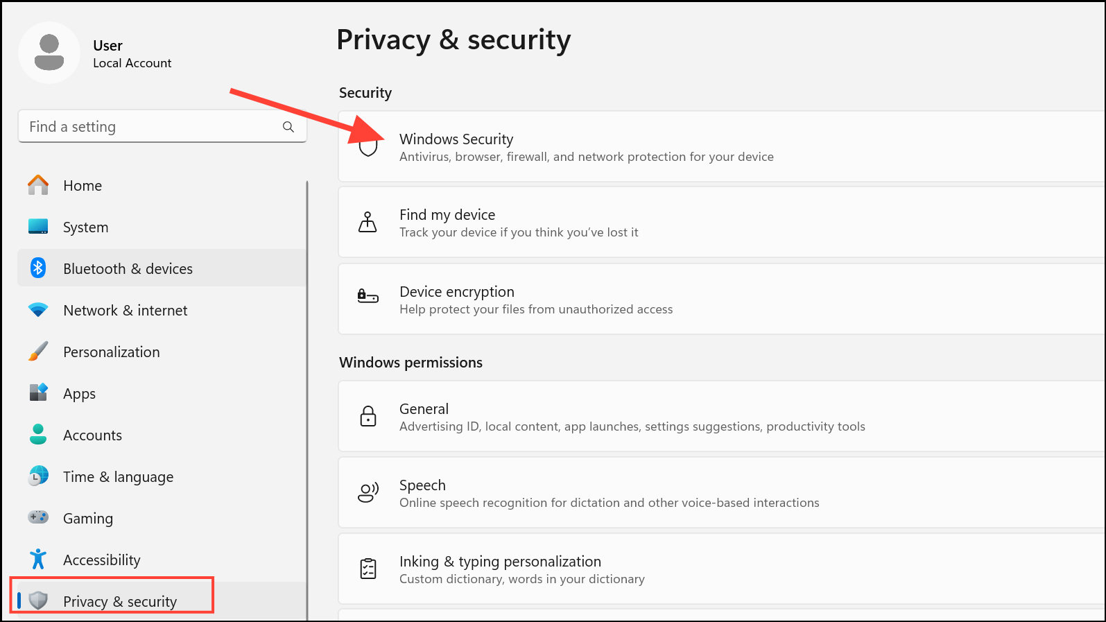 Go to Privacy & Security: In the left sidebar, select Privacy & security, and then click Windows Security on the right.