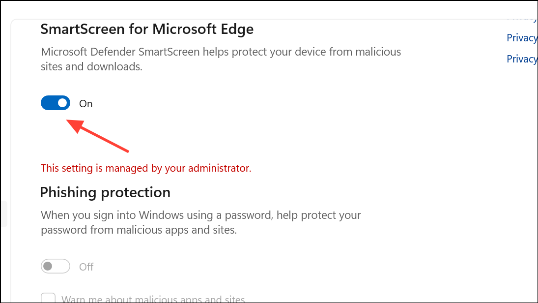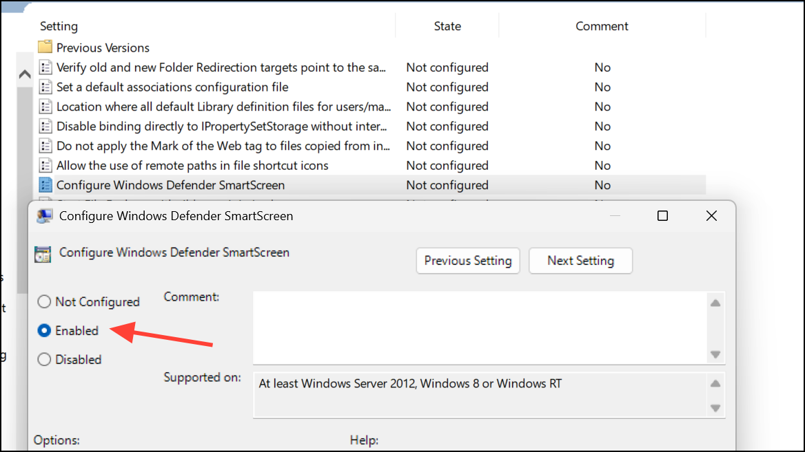 On Windows 11 Pro or Enterprise, group policy settings might override your user controls. If SmartScreen is disabled by policy, you can re-enable it: