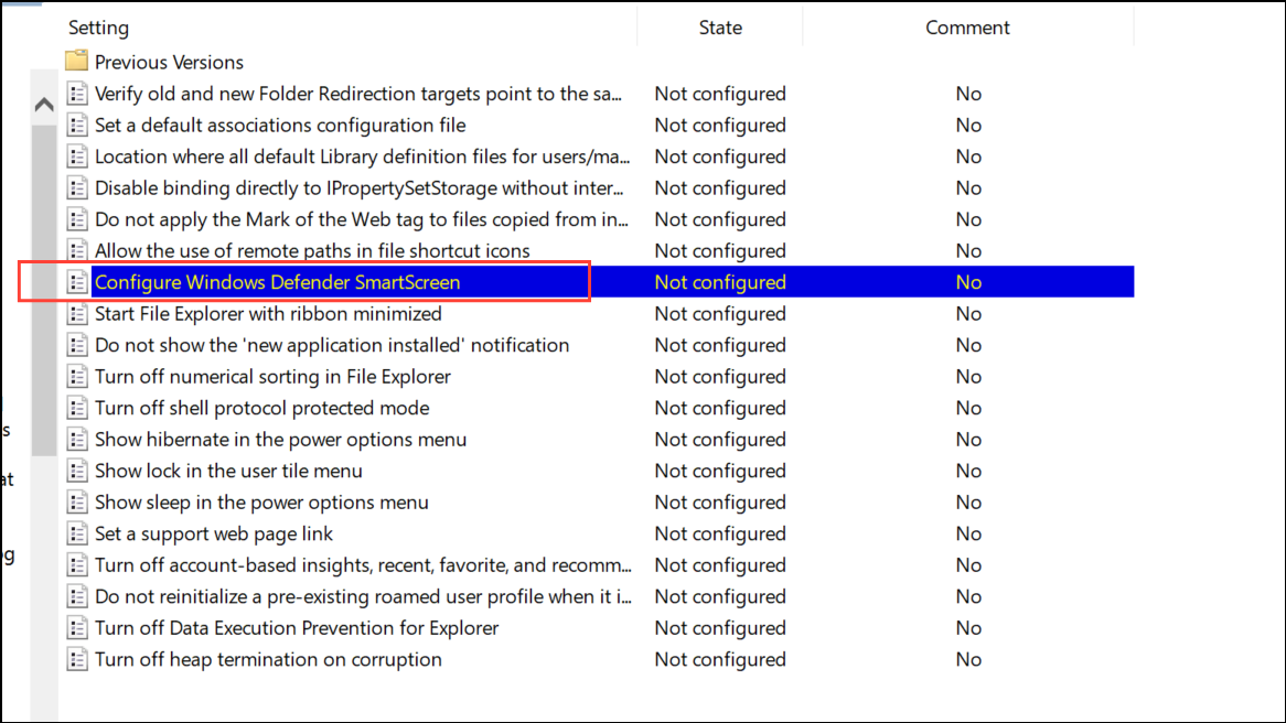 Configure SmartScreen: In the right pane, double-click Configure Windows Defender SmartScreen.