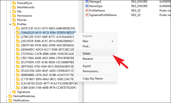 - Right-click the subkey