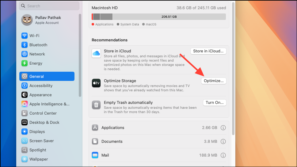 2- Wait for the storage graph to load. Hover over each section to see which categories (like Applications, Photos, System Data) consume the most space.