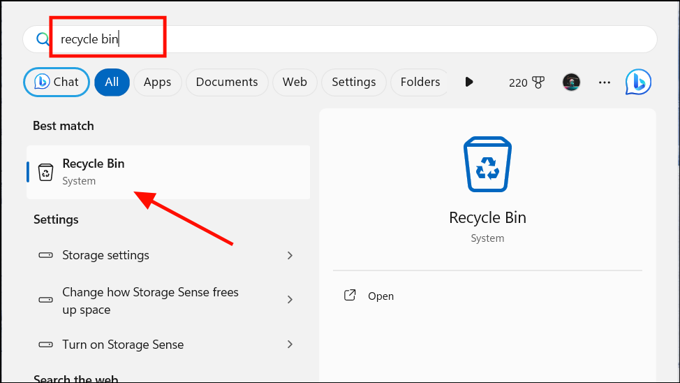 - Search: Press Start and type Recycle Bin