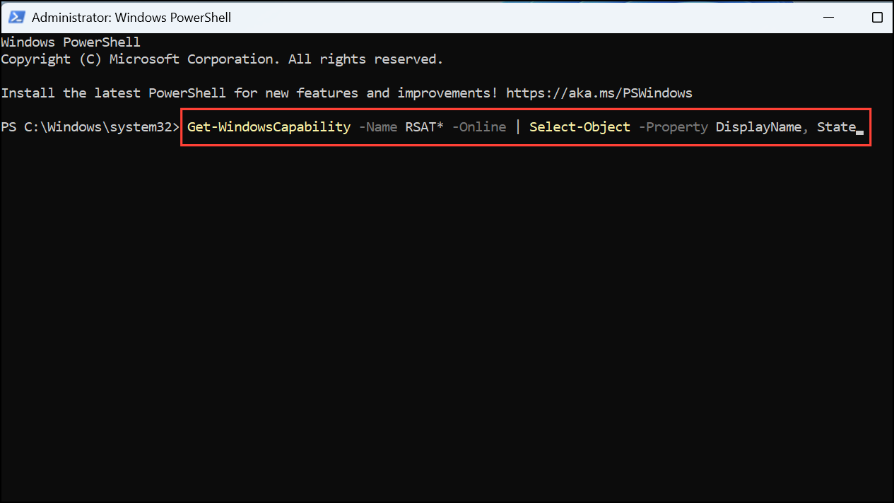 2- Listing RSAT Features: Execute the following command to see all available RSAT features and their installation status: 1Get-WindowsCapability -Name RSAT* -Online | Select-Object -Property DisplayName, State