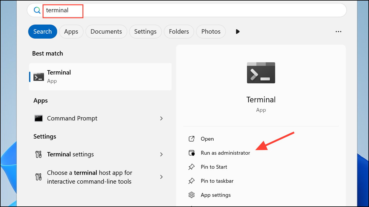3- In the search results, right-click on Windows Terminal and choose Run as administrator. Alternatively, click the small arrow next to the app and select Run as administrator from the expanded options.