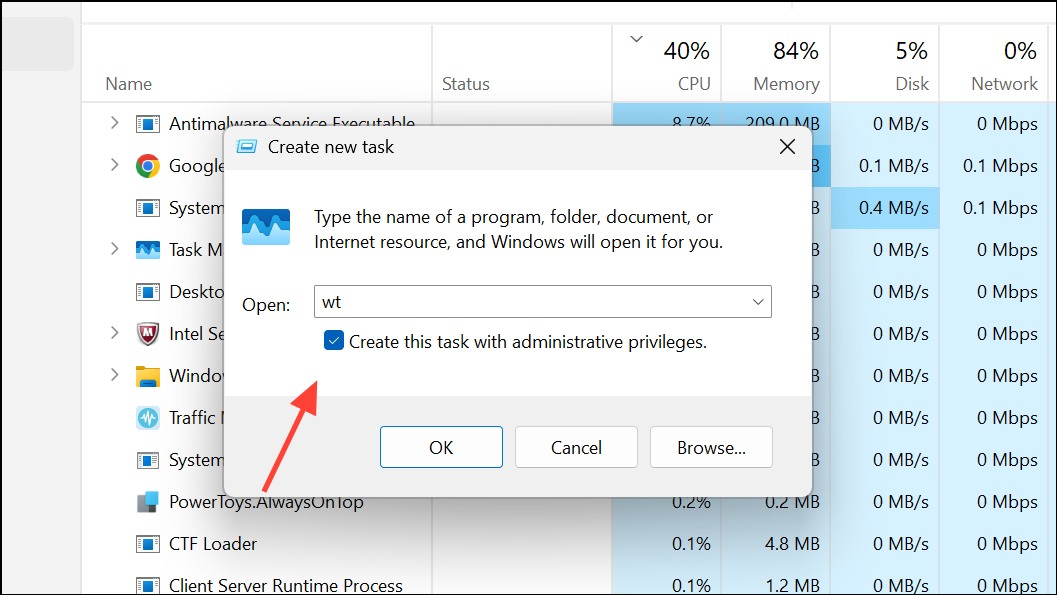 4- Check the box labeled Create this task with administrative privileges before clicking “OK.” This guarantees Windows Terminal launches with elevated permissions.