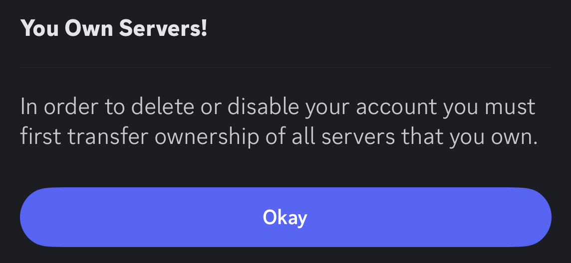 If you own any Discord servers, you must transfer ownership or delete them before your account can be removed.