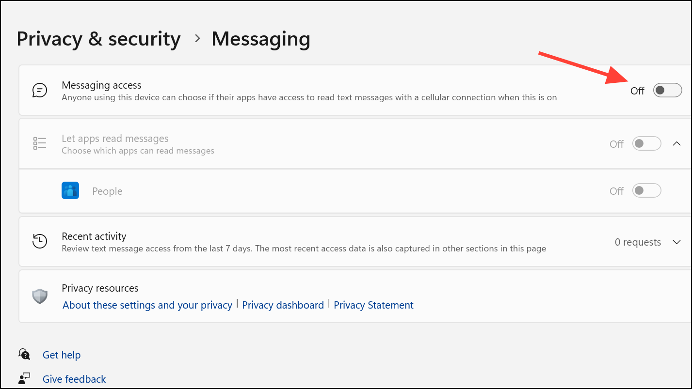 - Disable access: Toggle the switch Off to block an app from accessing your messages.