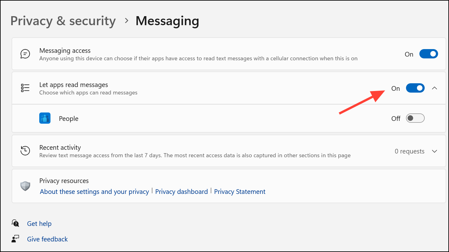 - Enable access: Toggle the switch On to allow an app to read and send messages.