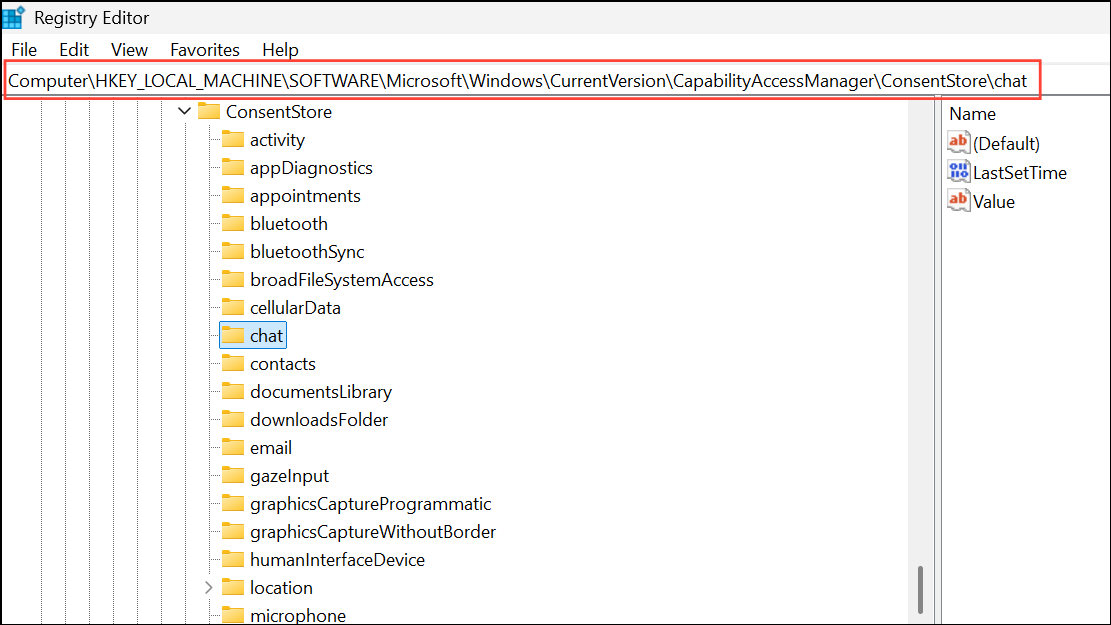 2- Navigate to the Messaging Key: In the Registry Editor, browse to the following location: HKEY_LOCAL_MACHINE\SOFTWARE\Microsoft\Windows\CurrentVersion\CapabilityAccessManager\ConsentStore\chat