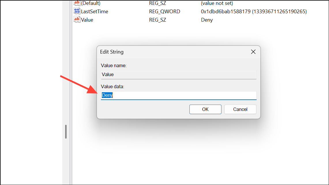 4- Set the Value to Deny: In the “Value data” field, change the value to “Deny”. This blocks all apps from accessing your messages.