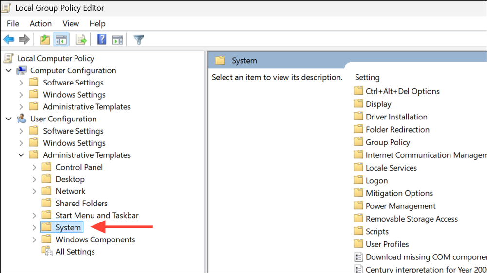 2- Navigate to the Policy: Go to User Configuration > Administrative Templates > System.