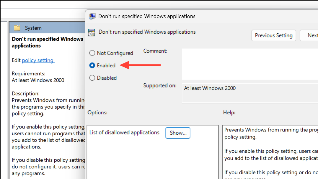 4- Enable the Policy and Specify Apps: Enable the policy and then click “Show” to add the executable names (e.g., appname.exe) of the apps you want to block.