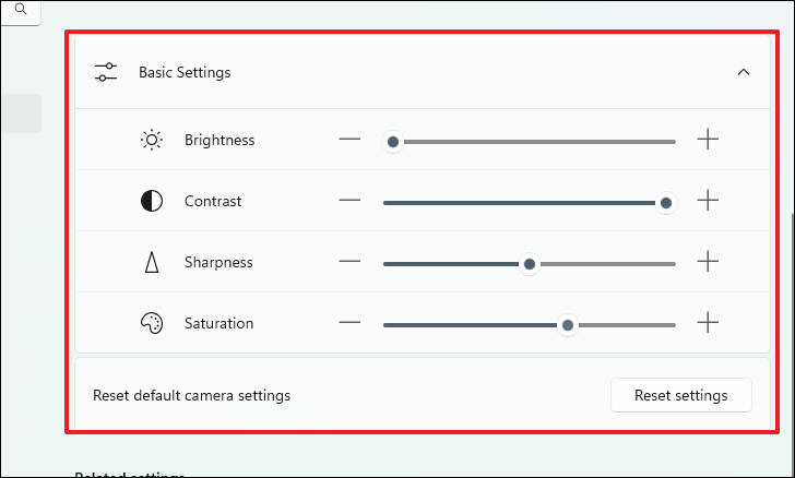 Windows 11 allows basic camera tuning. Use the available sliders to adjust: